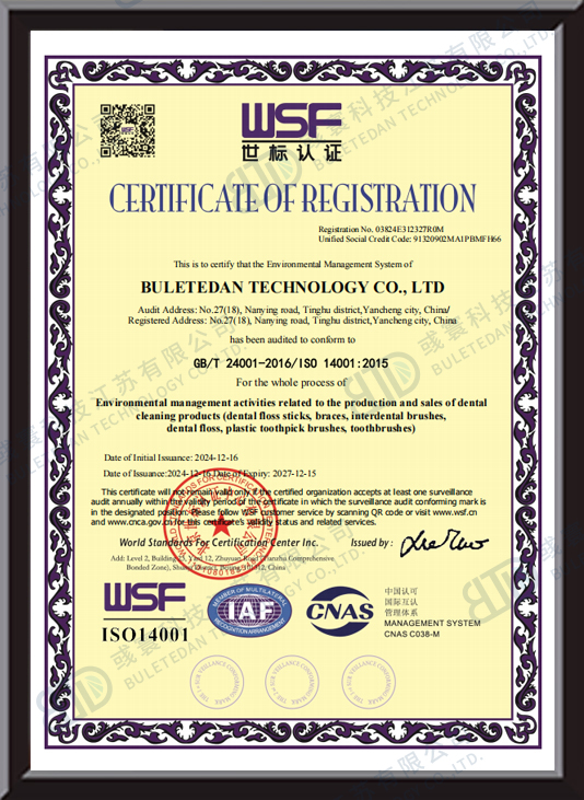 La division de soins bucco-dentaires de Liuerfeng Kunshan a obtenu plusieurs certifications, notamment la certification environnementale ISO 13485, CE, ISO 9001 et Green Leaf.