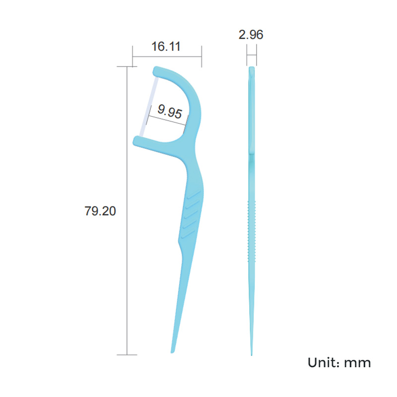 Construction en forme de F pour l'ergonomie, avec une extrémité en forme de cure-dent et un design incurvé pour un ajustement optimal entre les dents